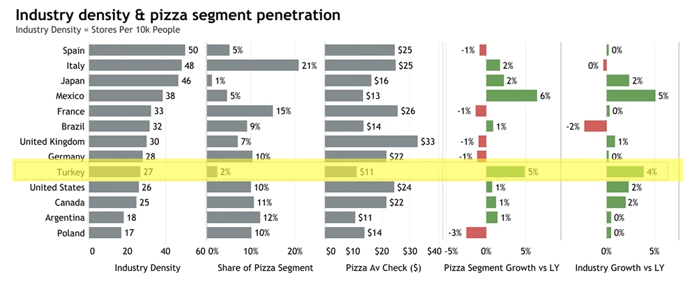 The numbers reframe the picture. Turkey’s dining-out culture is vibrant, but pizza barely registers: about 2 percent of sales, compared with 9 percent in mature markets.