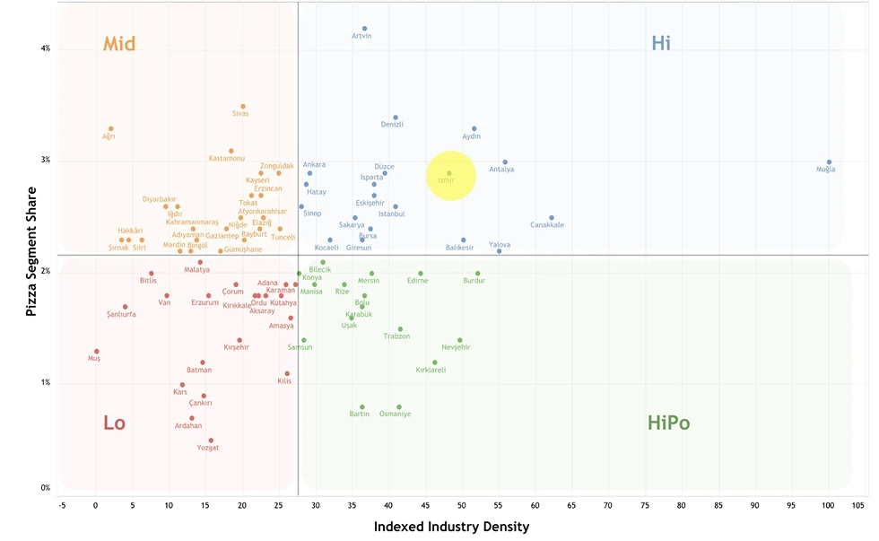 The western seaboard and tourist regions light up in the high-potential quadrant: places where people eat out often, but pizza is hardly present. Istanbul, by contrast, is clearly high/high: undeniable scale, but also saturated with rivals.