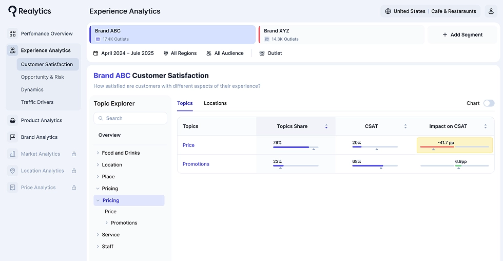 The same logic applies to restaurants. Suppose a café sees stable ratings but feels it is underperforming. Realytics can show whether the real issue is speed of service, the balance of price and quality, or the comfort of the space. Instead of guessing, managers see exactly which factor pulls satisfaction down — and what will lift it fastest if addressed.